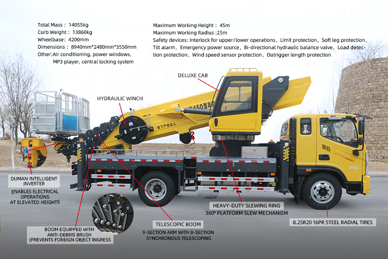 Được thiết kế trên khung gầm Foton Aoling và trang bị động cơ Cummins 190HP, GK45 có thể đạt chiều cao làm việc lên đến 45 mét với tầm với tối đa 25 mét. Cần trục 9 đoạn của máy có hệ thống ống lồng đồng bộ 8 cấp và hỗ trợ xoay liên tục 360° để đạt được độ linh hoạt tối đa. Các chân chống kiểu chữ X dài 7,7 mét, mang lại sự ổn định vượt trội. Sàn làm việc rộng rãi 3200mm chịu được tải trọng lên đến 300kg, được trang bị đầy đủ hệ thống điều khiển điện tử, điều khiển từ xa không dây và nguồn điện dự phòng khẩn cấp. Các hệ thống an toàn tích hợp bao gồm cảnh báo nghiêng, bảo vệ chân chống và cảm biến tốc độ gió—biến GK45 trở thành giải pháp tuyệt vời cho các nhiệm vụ phức tạp, trên cao.